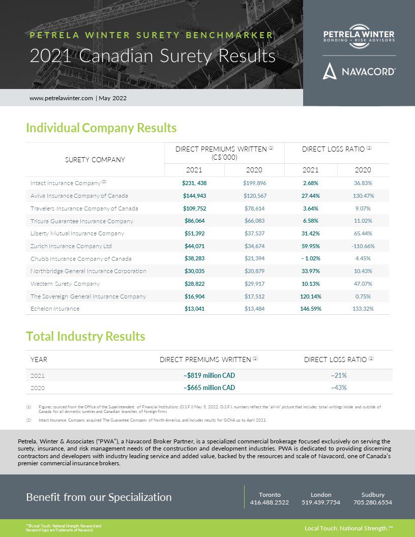 Our compliments go out to the Canadian Surety Industry on the outstanding results achieved in 2021. The Surety Industry’s success is a function of the stability in the underlying construction economy, a testament to the resiliency of construction contractors during the pandemic, and affirming, once again, our long-held view that contractors are amongst the most dynamic and resourceful entrepreneurs on the planet!